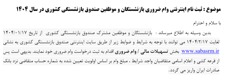 ثبت نام اینترنتی وام ضروری بازنشستگان و موظفین صندوق بازنشستگی کشوری ۲۰ فروردین ۱۴۰۴ | ۱۱:۵۹ کد : ۵۰۶۴۱ اطلاعیه ارسال به دیگران نام شما ایمیل شما ایمیل دریافتکننده ارسال انصراف تعداد بازدید:۵۱۰۸ ثبت نام اینترنتی وام ضروری بازنشستگان و موظفین صندوق بازنشستگی کشوری