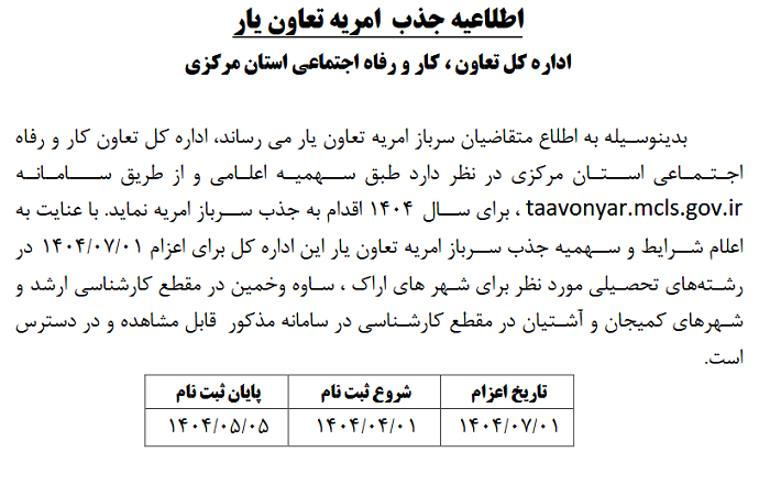 اطلاعیه جذب امریه تعاون یار ۱۱ تیر ۱۴۰۴ | ۱۲:۰۴ کد : ۵۲۷۴۸ اطلاعیه ارسال به دیگران نام شما ایمیل شما ایمیل دریافتکننده ارسال انصراف تعداد بازدید:۱۲۳۸ اطلاعیه جذب امریه تعاون یار