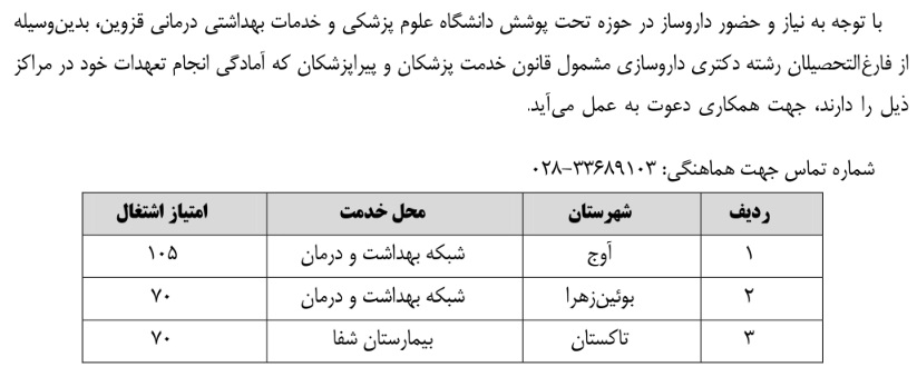 جذب نیروی داروساز مشمول قانون خدمت ۲۵ آذر ۱۴۰۴ | ۰۹:۰۰ کد : ۵۷۰۵۷ اطلاعیه ارسال به دیگران نام شما ایمیل شما ایمیل دریافتکننده ارسال انصراف تعداد بازدید:۶۴۲ جذب نیروی داروساز مشمول قانون خدمت در دانشگاه علوم پزشکی قزوین