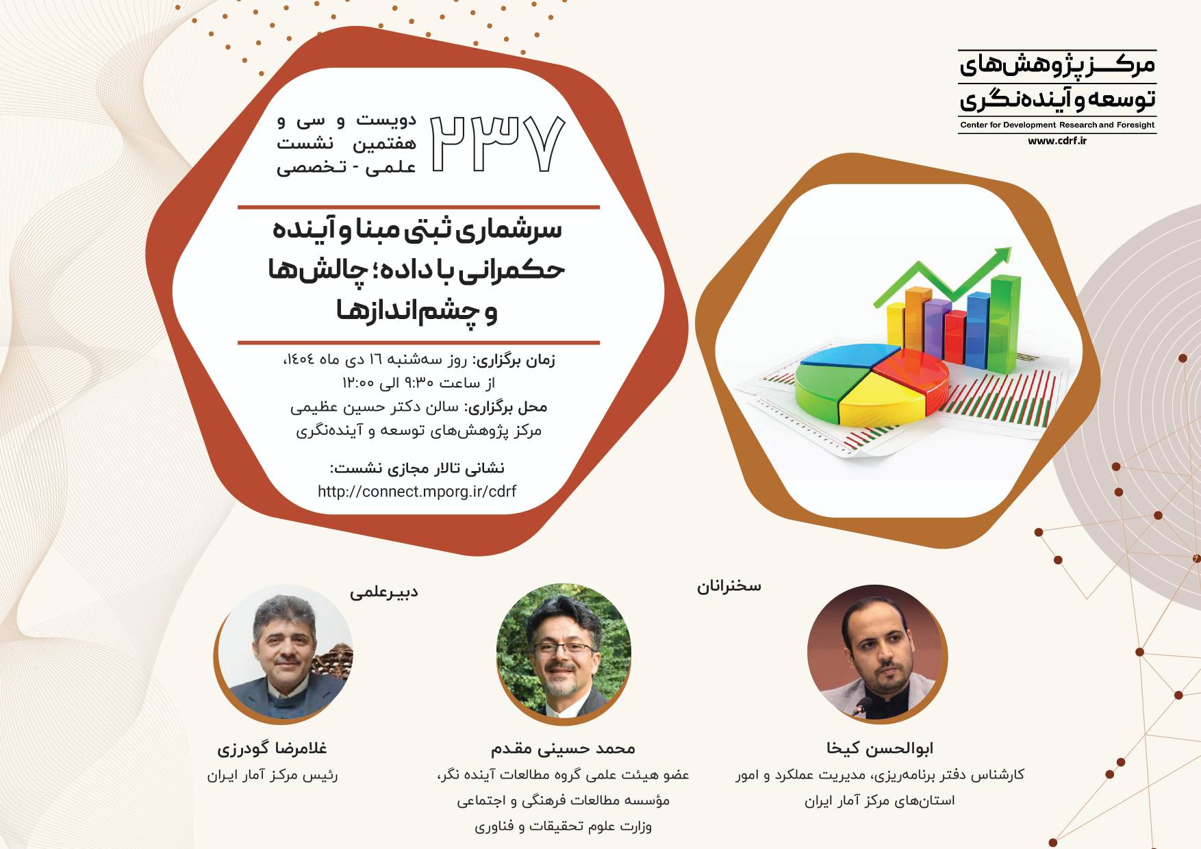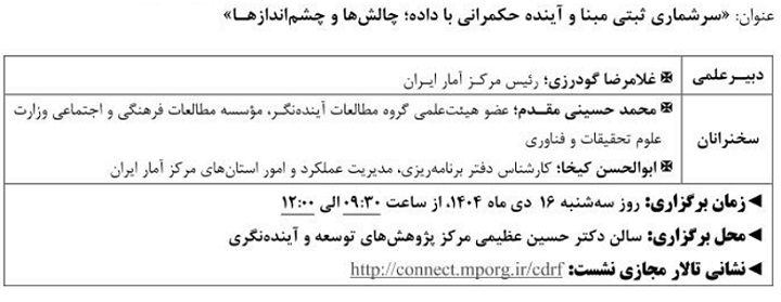 نشست علمی سرشماری ثبتی مبنا آینده حکمرانی با داده ۱۴ دی ۱۴۰۴ | ۱۰:۲۱ کد : ۵۷۴۱۸ اطلاعیه ارسال به دیگران نام شما ایمیل شما ایمیل دریافتکننده ارسال انصراف تعداد بازدید:۵۴۹ دویست وسی وهفتمین نشست علمی - تخصصی با عنوان سرشماری ثبتی مبنا آینده حکمرانی با داده، چالش ها وچشم اندازها